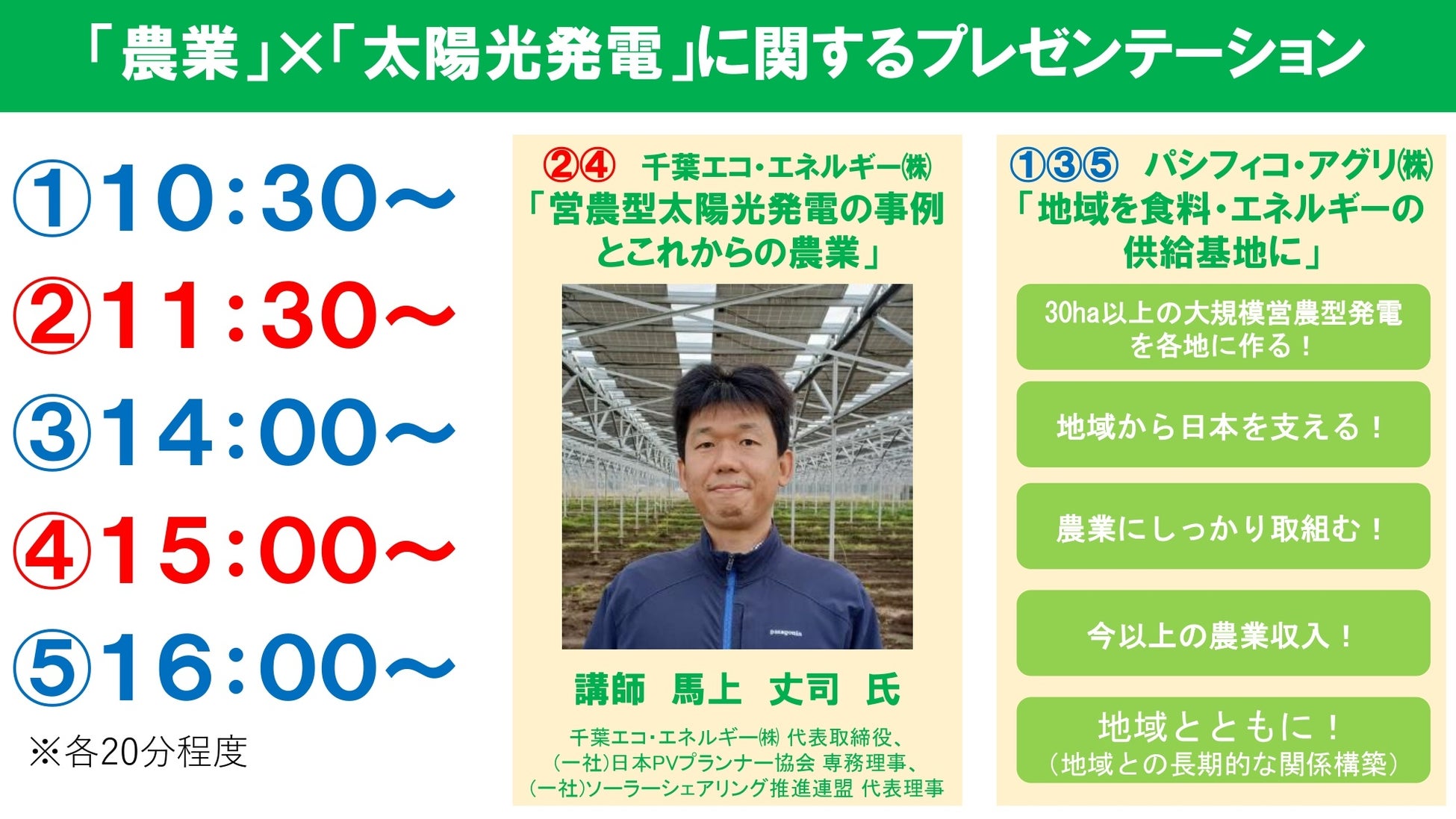 千葉エコ・エネルギー株式会社(本社:千葉県千葉市、代表取締役:馬上丈司)は2023年10月11日(水)から13日(金)に幕張メッセで開催される「第13回農業WEEK」にてパシフィコ・アグリ株式会社(本社:東京都港区六本木、代表取締役:松尾大樹)が出展するブースに代表馬上が登壇させていただきます。「営農型太陽光発電の事例とこれからの農業」をテーマに10/12 11:30~, 15:00~、10/13 11:30~, 15:00~各20分のプレゼンテーションをさせていただきます。