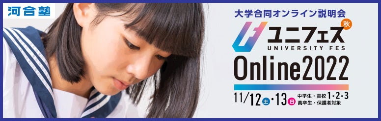学校法人河合塾と株式会社KEIアドバンスは、11月12日(土)・13日(日)に開催する大学合同オンライン説明会『ユニフェスOnline2022秋』の予約受付を開始しました。本説明会は全国123の大学が参加する合同オンライン説明会です。