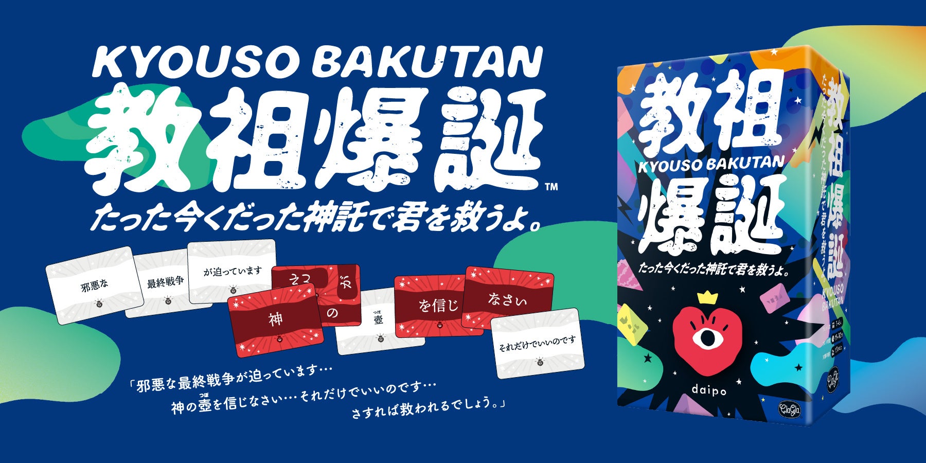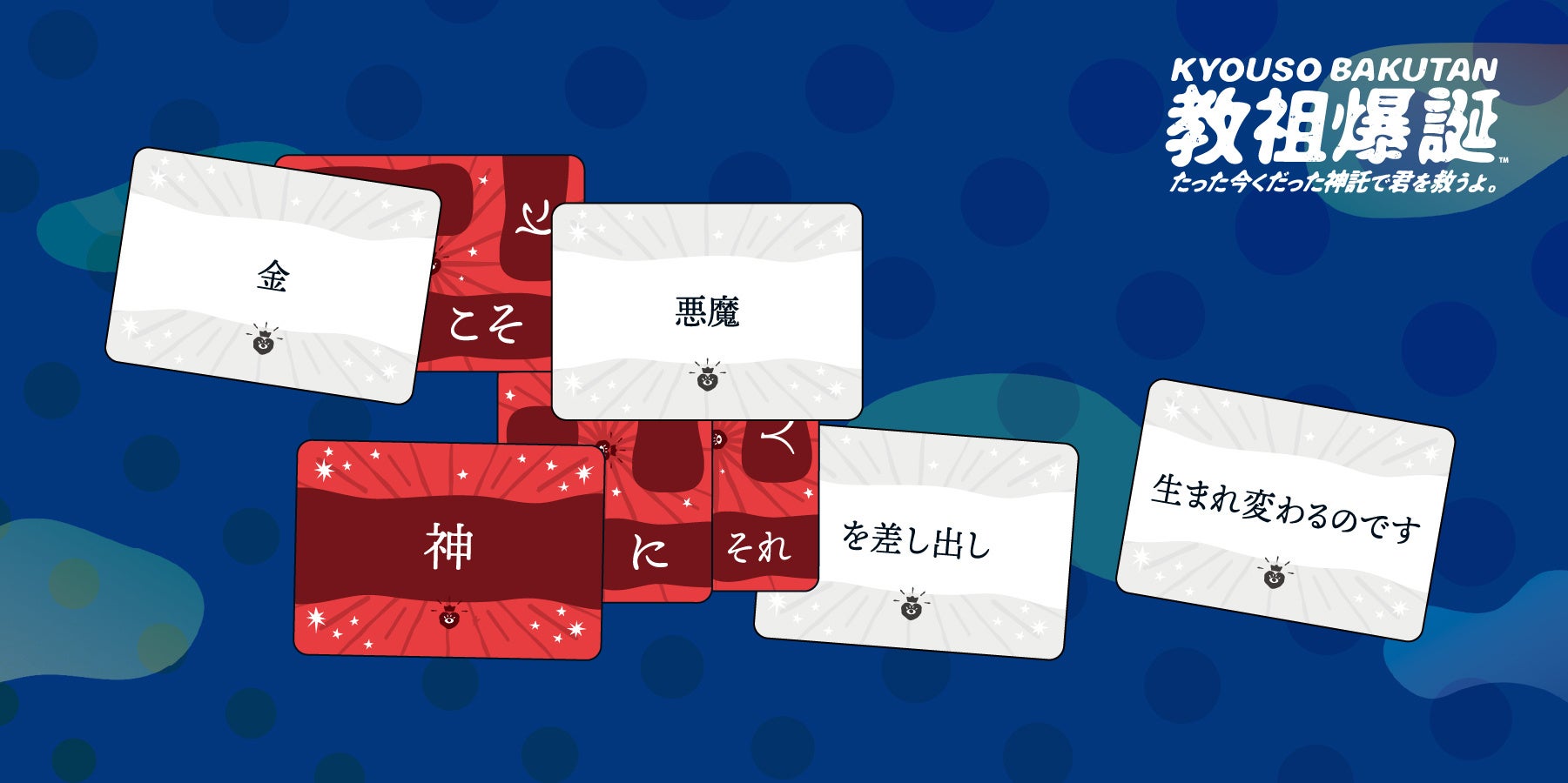 『教祖爆誕 たった今くだった神託で君を救うよ。(以下『教祖爆誕』)』は、シリーズ累計25万部のボードゲーム『たった今考えたプロポーズの言葉を君に捧ぐよ。(以下『今プロ』)』初のスピンオフ作品となります。簡単ルールはそのままに、これまでとは全く異なる世界観を体験できるゲームとなっています。