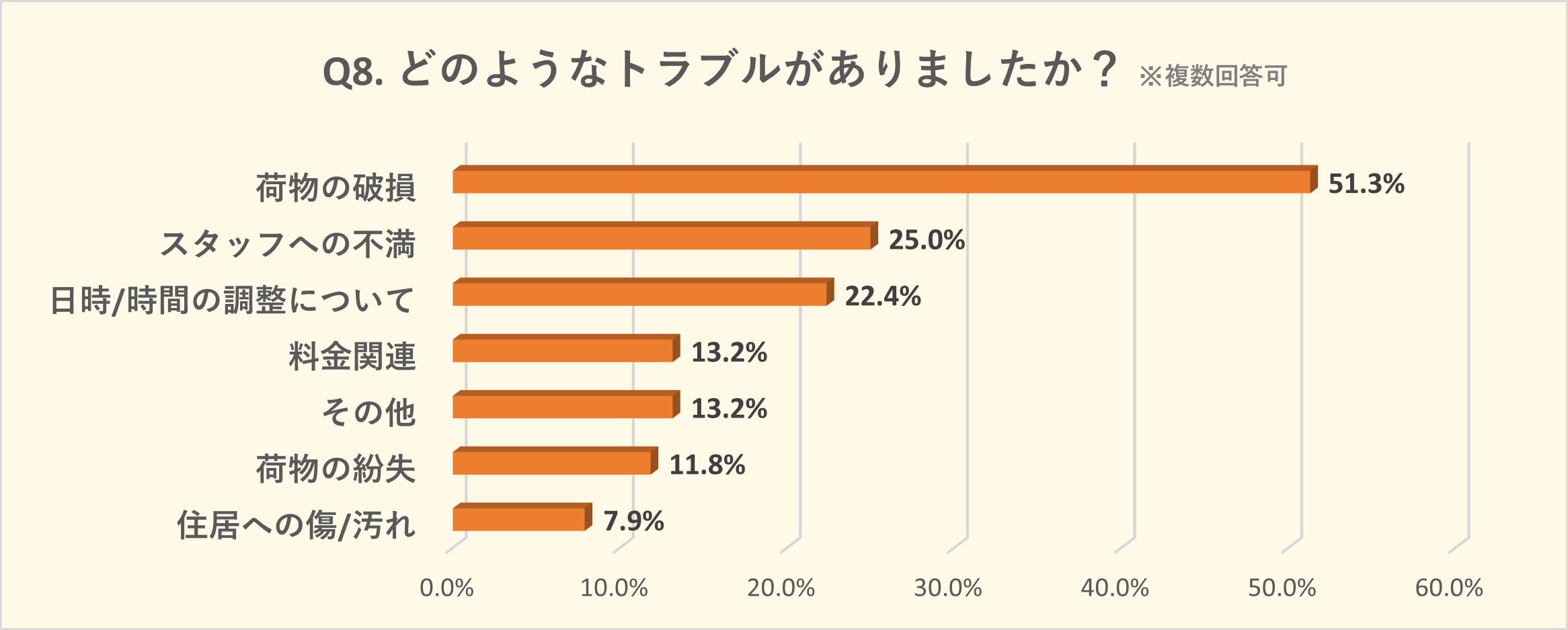 トラブルの内容としては「荷物の破損」51.3%が圧倒的得票で1位。続いて「スタッフへの不満」25.0%や「日時/時間の調整について」22.4%など、引っ越し業者とのやり取りにおいての不満が2位と3位にランクインしました。