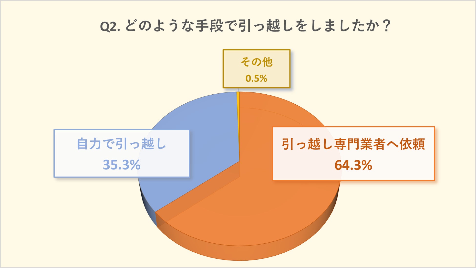 主流である「引っ越し専門業者へ依頼」は64.3%に留まり、専門業者へと丸投げせずに「自力で引っ越し」の手配をした方が35.3%にものぼることが分かりました。