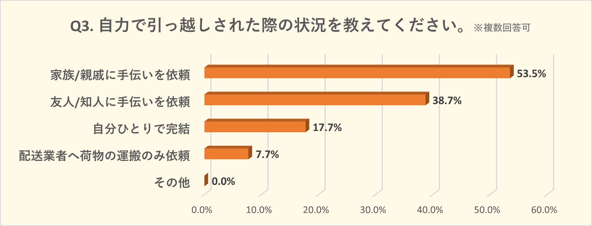 「家族/親戚に手伝いを依頼」53.5%、「友人/知人に手伝いを依頼」が37%で1位と2位ということから、多くの方が身近な誰かに助っ人を頼んでいることが分かります。
