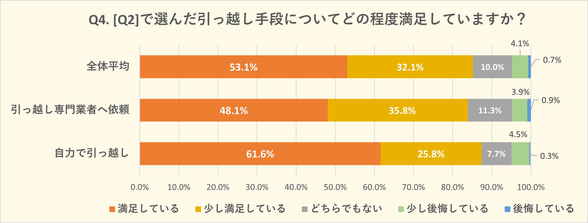 次にご自身が選んだ引っ越しの手段についての満足度について調査を行いました。全体の数値だけでなく「引っ越し専門業者へ依頼」と「自力で引っ越し」それぞれ抜粋した結果も合わせて発表いたします。