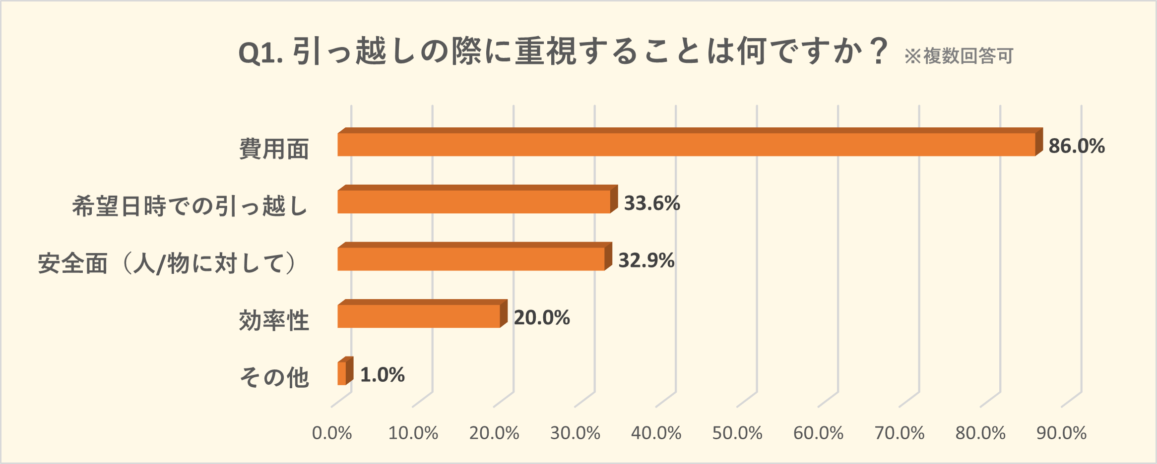 1) 引っ越しにおいて重視するポイントは「費用面」が86%で圧倒的1位を獲得。