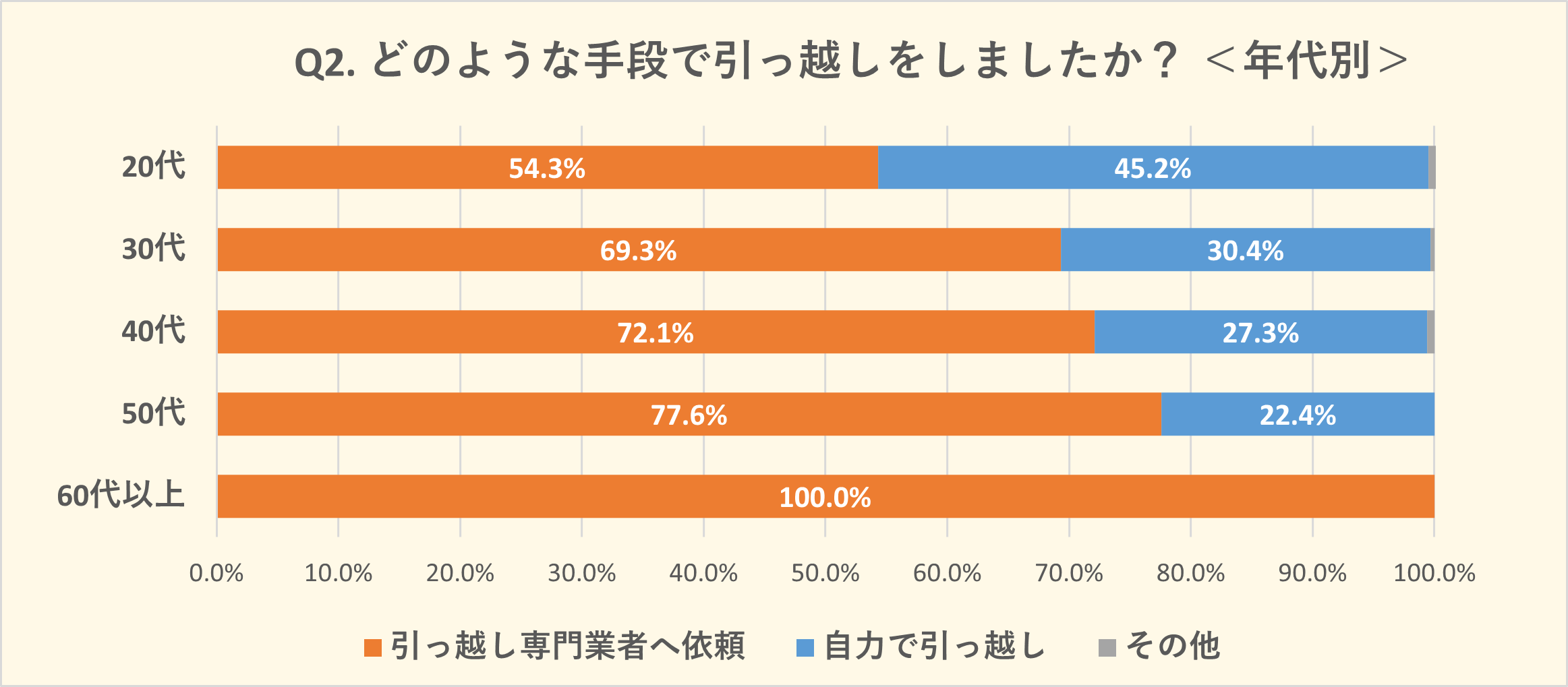 この結果を年代別にみてみると、若年層になるにつれて「自力で引っ越し」をする方の割合は高くなり、20代においては45.2%にのぼります。