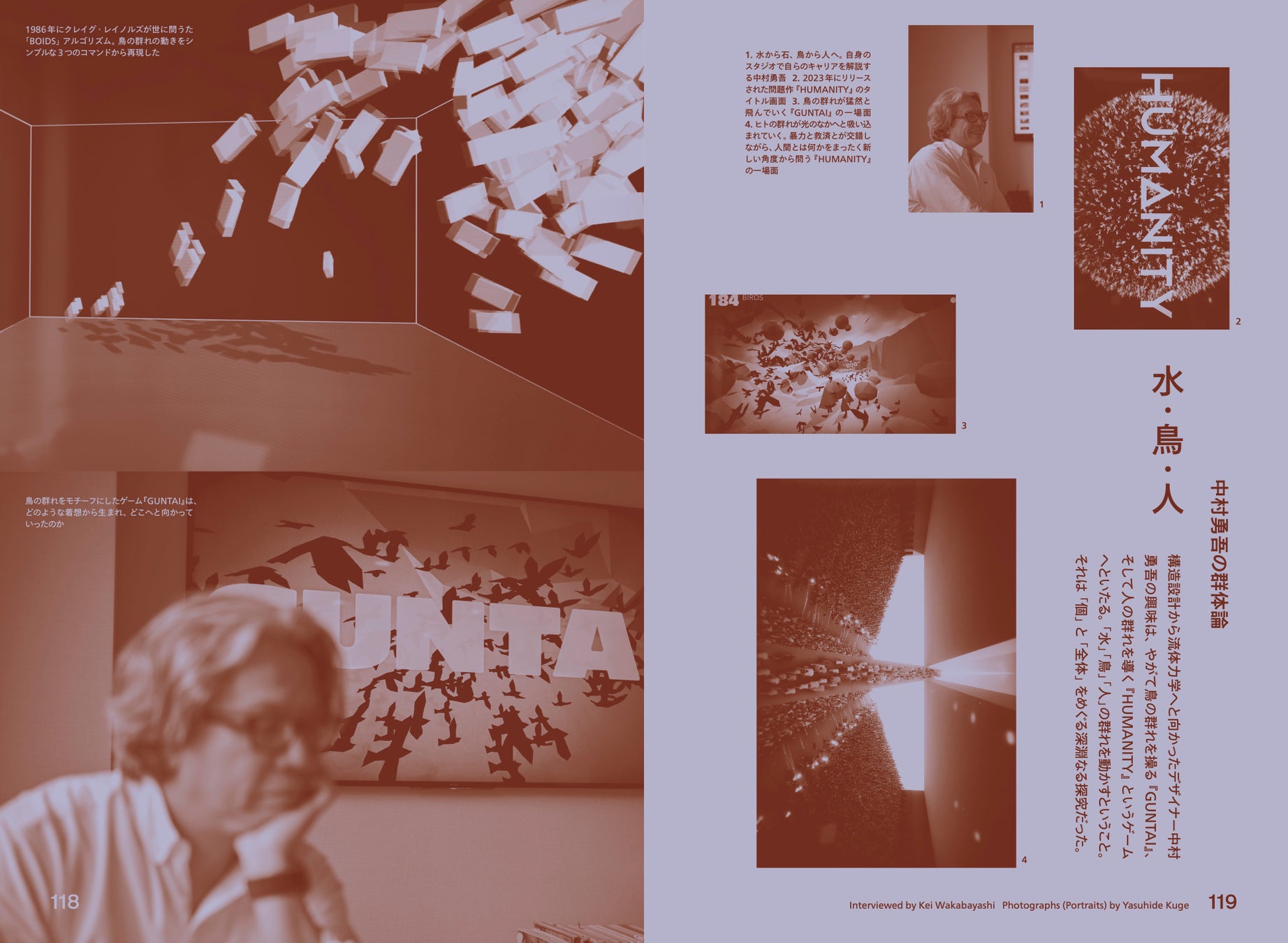 構造設計から流体力学へと向かったデザイナー中村勇吾の興味は、やがて鳥の群れを操る『GUNTAI』、そして人の群れを導く『HUMANITY』というゲームへといたる。群れを動かすということ、それは「個」と「全体」をめぐる深淵なる探究だった。