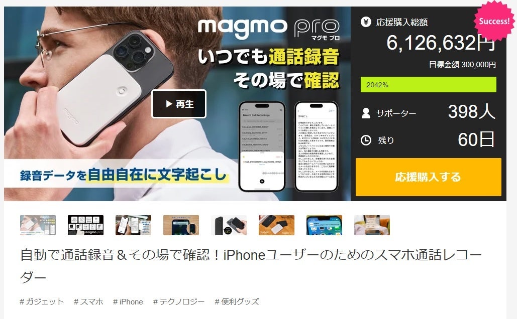 8月24日(木) 8時より公開したプロジェクトmagmo pro(マグモプロ) が、開始1週間で、目標金額2000%達成!総額600万円を超えました。