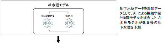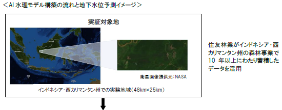 このAIモデルは住友林業が管理するインドネシアの熱帯泥炭地で10年以上かけて計測を続けてきた地下水位データを教師データ※4としてAIによる機械学習と物理モデル※5を複合したオリジナルモデルです。