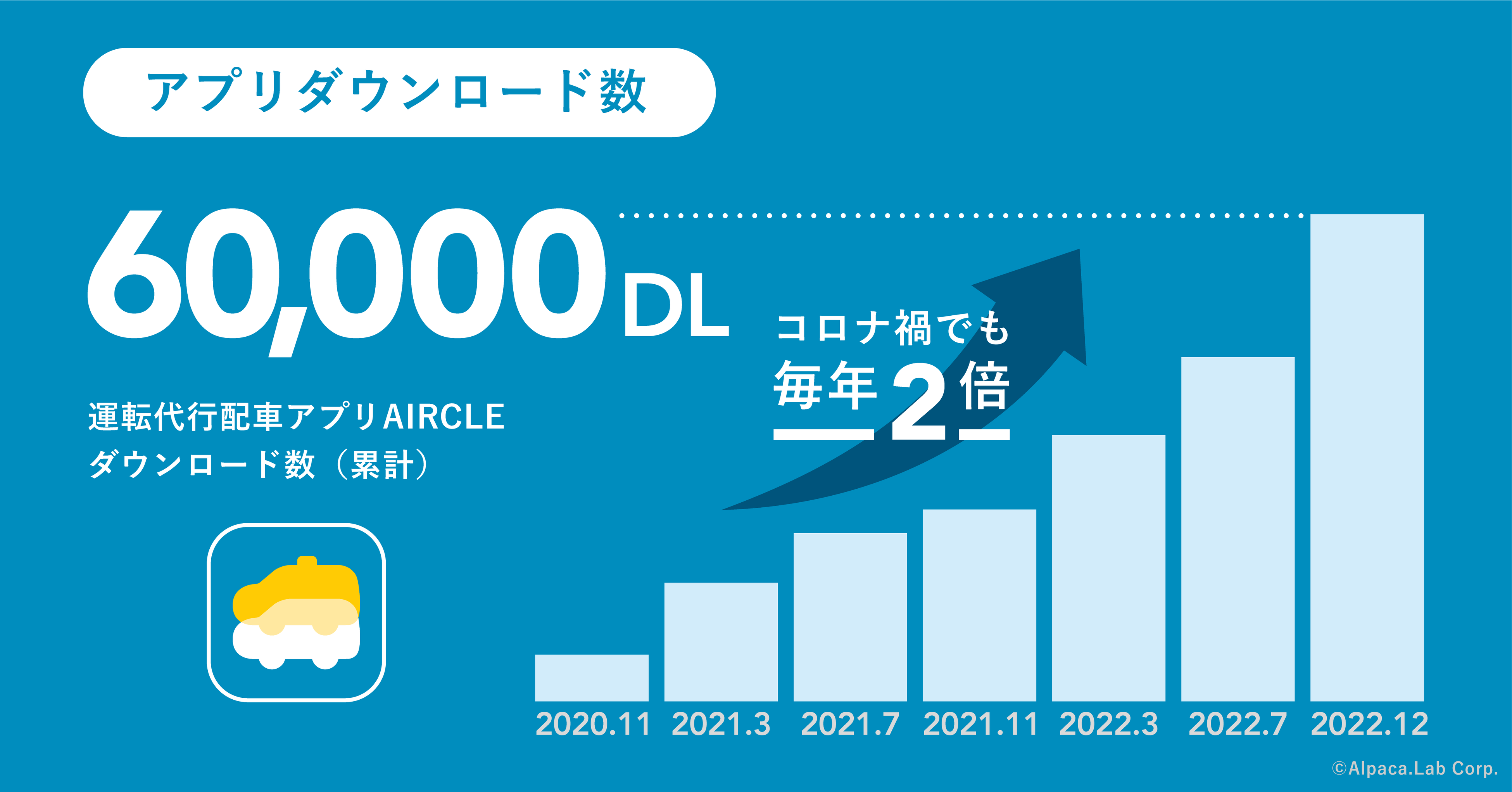 エアクルは運転代行業界の課題解決を目的として開発され、2020年8月に配車アプリ「AIRCLE(エアクル)」をリリースし、沖縄県にて展開を開始しました。アプリによる配車は平均30秒、平均到着時間は9分となり、従来と比較すると約80%以上の時間短縮に成功し、今までにない配車体験と業務改善を実現しました。現在は福岡県に展開し、利用者は60,000ダウンロード、累計注文数は12万件を突破。運転代行業者は140業者300台以上が登録されるまでに成長しました。