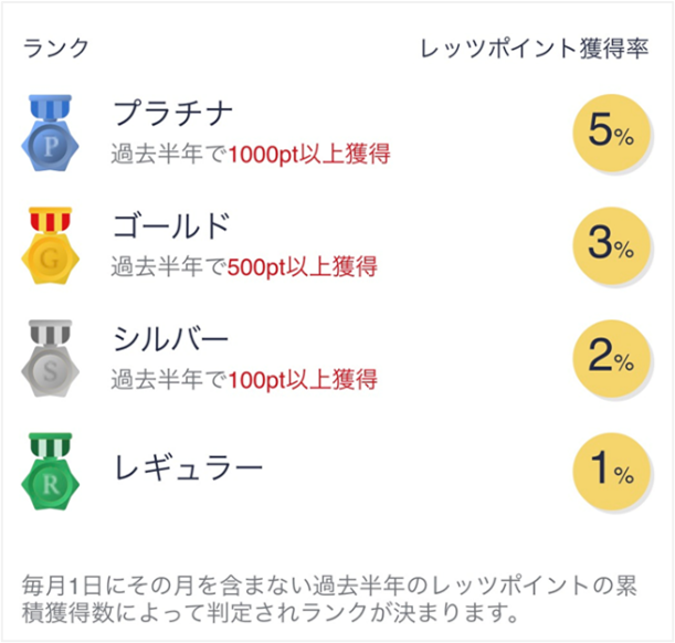 「レッツポイントクラブ」は、レギュラー、シルバー、ゴールド、プラチナの4ランクの設定で、ランクに応じて、レッツポイントの獲得率がアップします。ランクは、過去半年間の累積獲得ポイント数によって決定します。