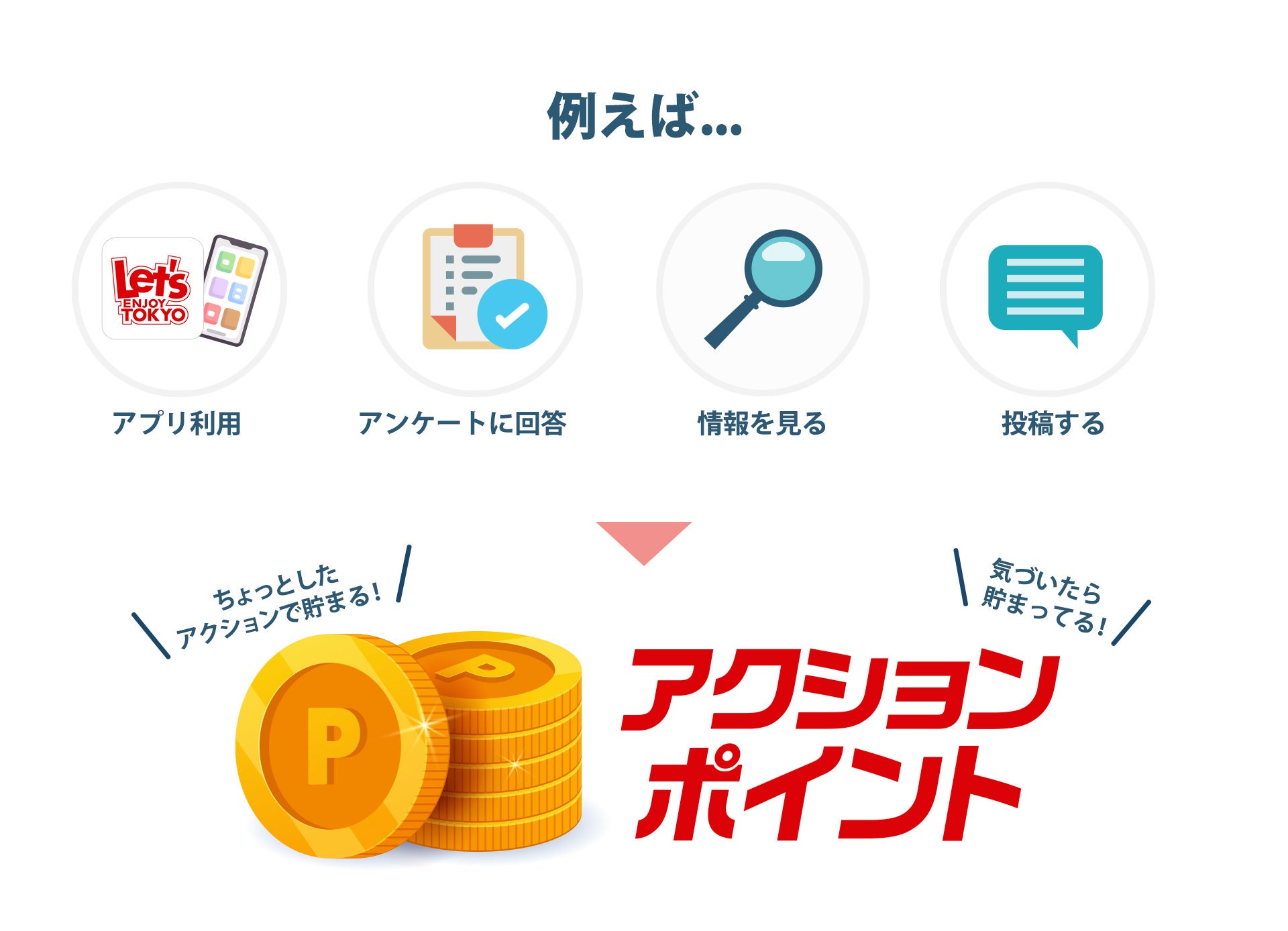さらに、レッツエンジョイ東京のアプリを起動したり、アンケートに応えたり、サイト内の特定の情報を見るなど、さまざまなアクションに応じてポイントがもらえる「アクションポイント」サービスも同時にスタートします。「アクションポイント」は、100アクションポイントが貯まると、1レッツポイントと交換することができます。「アクションポイント」は有効期限がないので、気軽に取り組んで、お得にご活用いただけます。