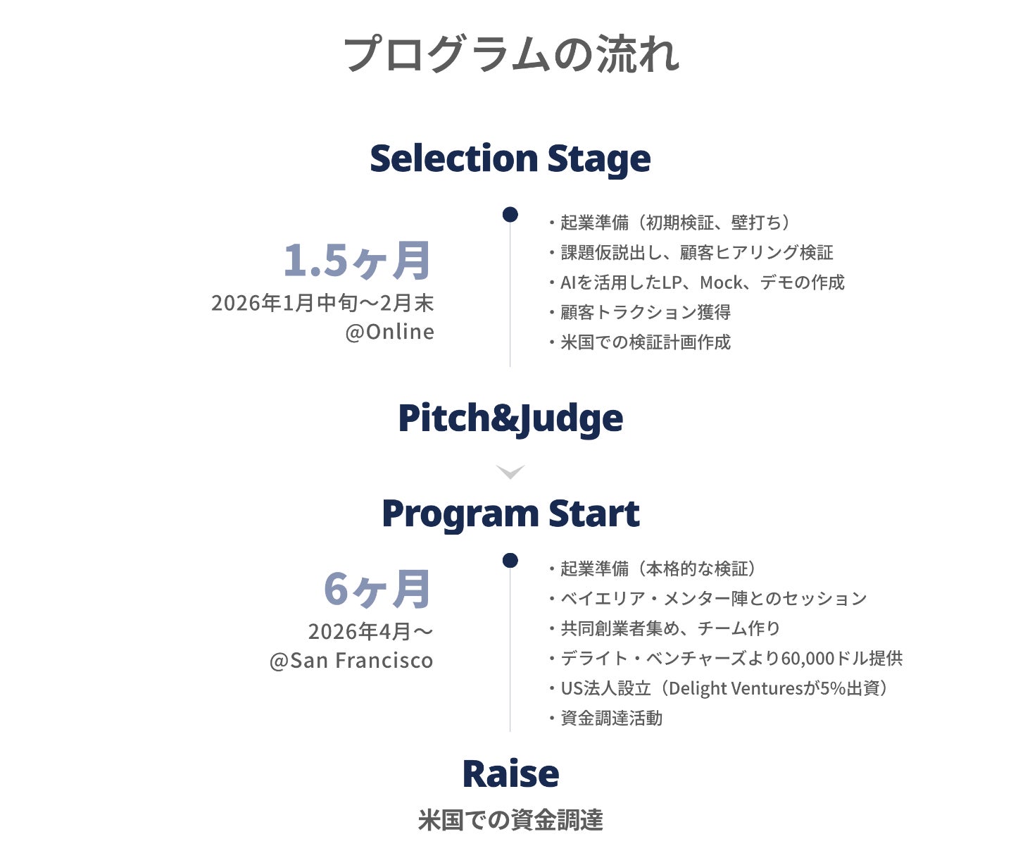 2025年6月に開始した第1回では、14名がサンフランシスコでのプログラムに参加し、既に現地で起業家を生み出しています。第2回は2026年1月に始動。国内での約1.5カ月の選考ステージを経て、選考に合格した参加起業家には、起業資金を得てサンフランシスコでの起業に挑戦していただきます。