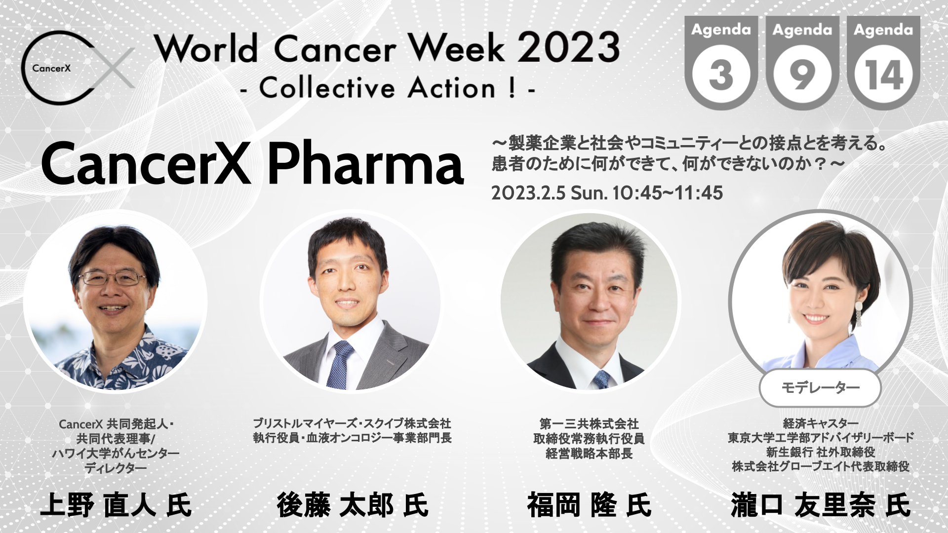 上野 直人さん ( ハワイ大学がんセンター ディレクター M.D., Ph.D., F.A.C.P. CancerX 共同発起人・共同代表理事 )、後藤 太郎さん ( ブリストル・マイヤーズ スクイブ株式会社 執行役員・ ヘマトロジー・オンコロジー事業部門長 、福岡 隆さん (第一三共株式会社 取締役 常務執行役員 経営戦略本部長 )が登壇し、モデレーター を 瀧口 友里奈 さん( 経済キャスター / 東京大学工学部アドバイザリーボード / 新生銀行 社外取締役 / 株式会社グローブエイト代表取締役 )が務めました。