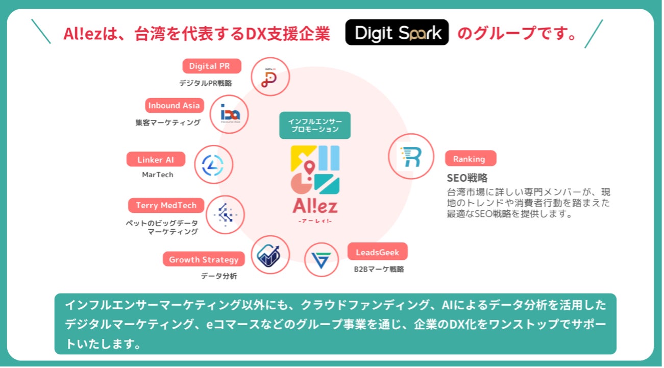 「Allez」は、アジア各地域の文化や消費習慣の違いを的確に把握したマーケティングサポートチームを擁し、越境インフルエンサーマーケティングを通じて、言語の壁を超えた効率的なマーケティングソリューションを提供します。また、「Allez」を運営する、Digit Sparkのグループ全体のリソースを活用した効果的な訪日マーケティングソリューションをワンストップで提供しています。