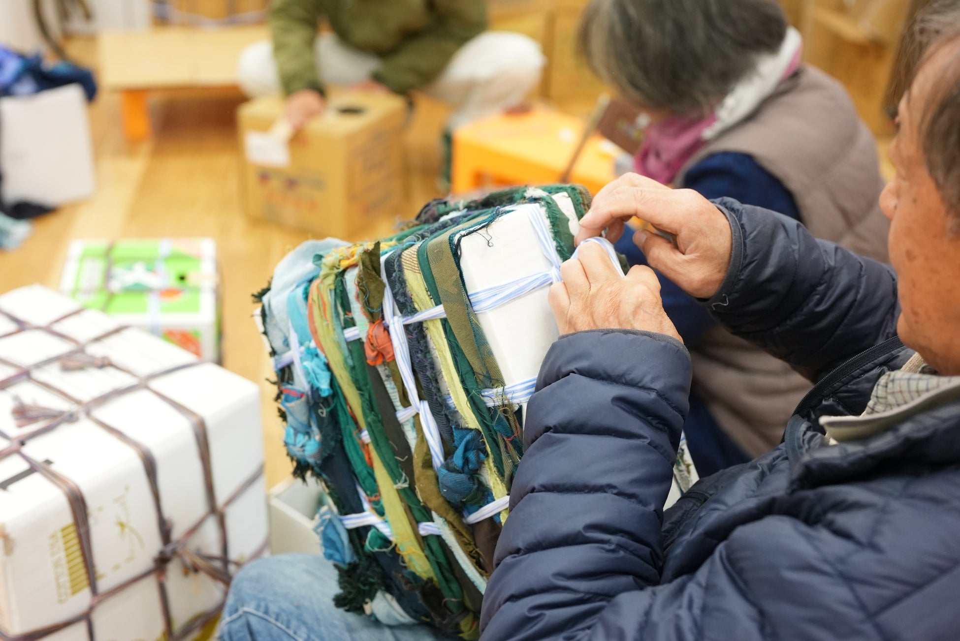 ハギレをつなぎ合わせてヨコ糸とし、ダンボールに張ったタテ糸に通す、手織りのようなワークショップ。やわらかな生地にふれて、ものづくりの楽しさを体感してください。