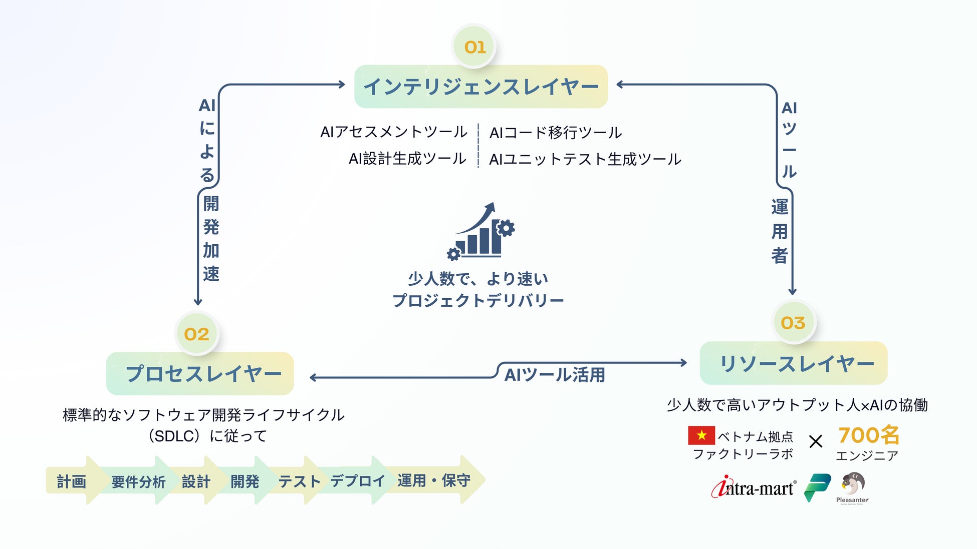 ベトナムにおけるオンサイトおよびオフショア体制を通じて、日本のIT人材不足の解消に貢献するとともに、開発スピードの向上、運用の標準化、そして持続可能な成長基盤の構築を支援します。