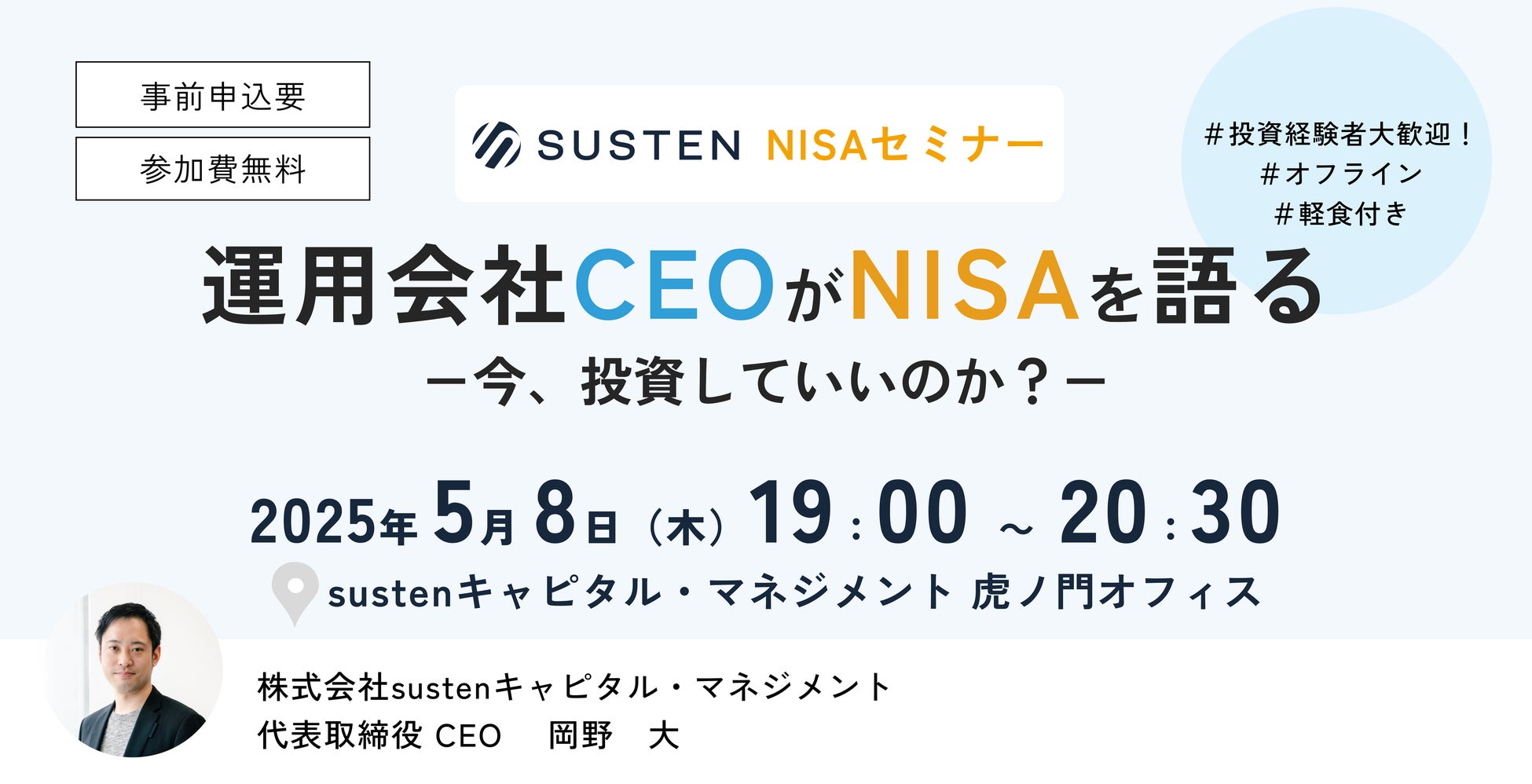 SUSTENは2025年1月31日に第1回NISAセミナーを開催し、大変好評をいただきました。今回は、より多くの方にご参加いただけるよう規模を拡大し、第2回「運用会社CEOがNISAを語るー今、投資していいのか?ー」を開催いたします。