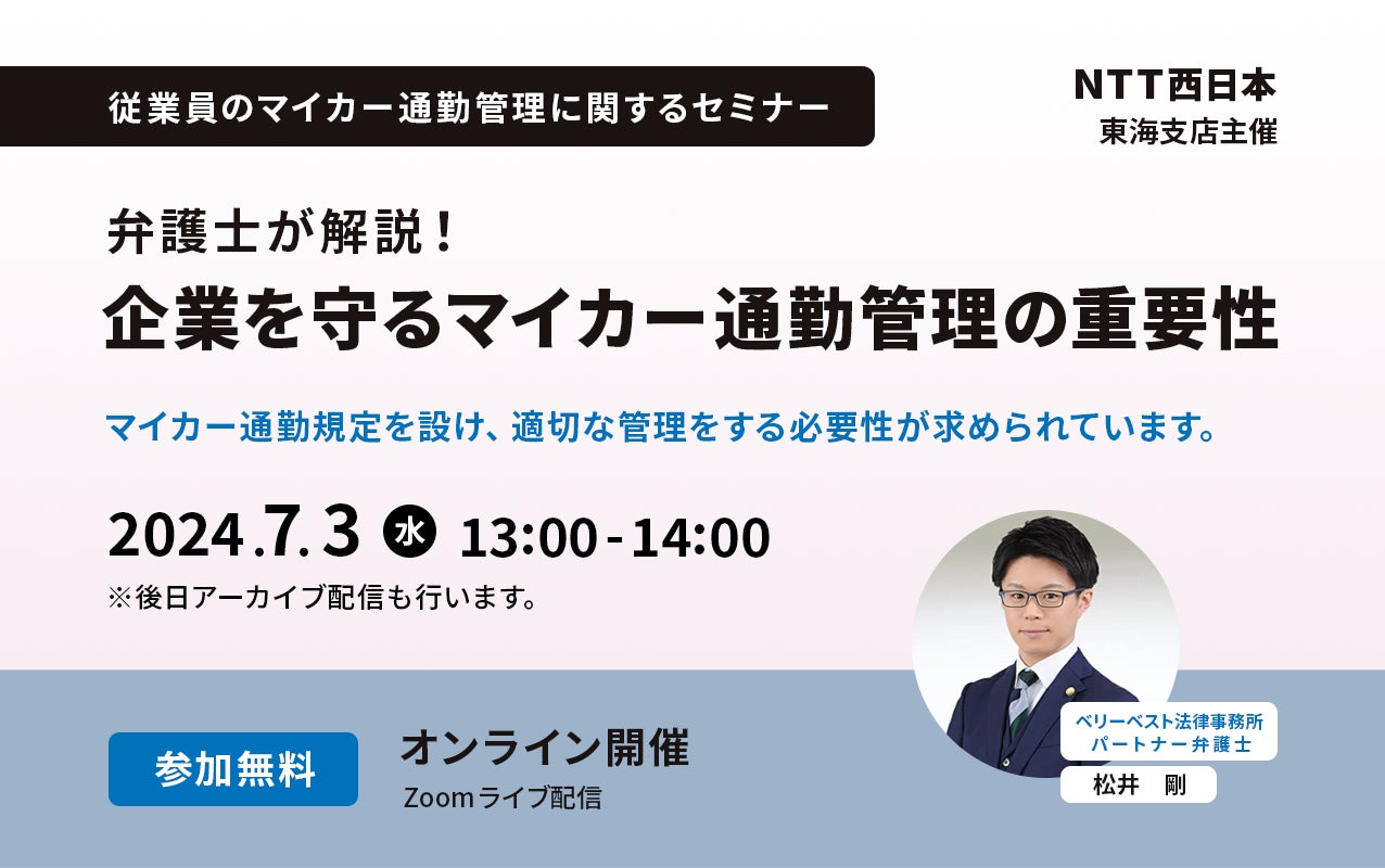 株式会社ドコモ・インシュアランス (以下ドコモ・インシュアランス)は、西日本電信電話株式会社東海支店(以下NTT西日本東海支店)他と2024年7月3日(水)オンラインにて特別共催セミナー「弁護士が解説!企業を守るマイカー通勤管理の重要性」を開催いたします。