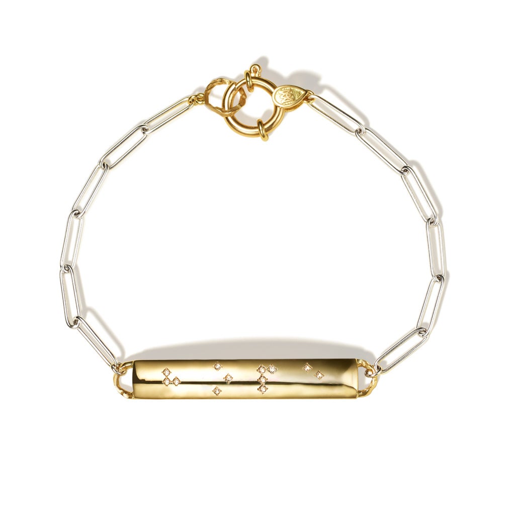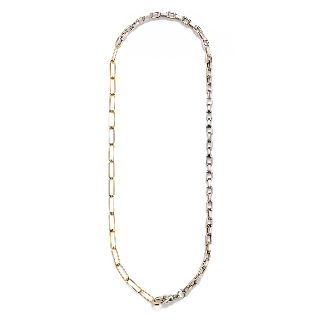 クラシックデュオチェーンⅠは、18金イエローゴールドのペーパークリップチェーンと、18金ホワイトゴールドの中空アンカーチェーンを組み合わせ、クラスプにダイヤモンドを石付けした美しいデザイン。単体ではもちろん、重ね付けやチャームを付けることによってパーソナライズできるアイテム。