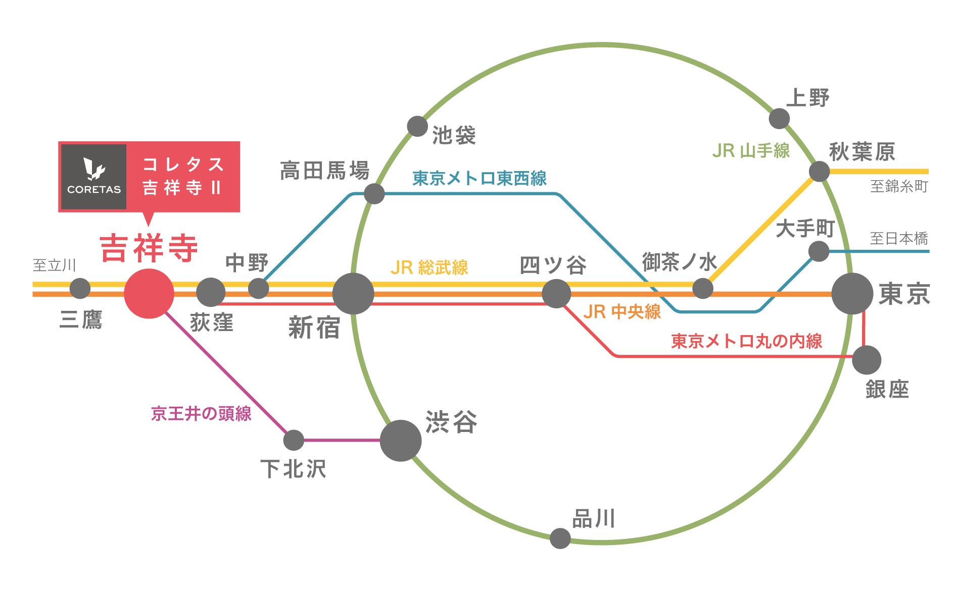 吉祥寺駅は、JR中央・総武線と京王井の頭線が利用でき、新宿・渋谷・東京駅といった大規模ターミナル駅に直結。