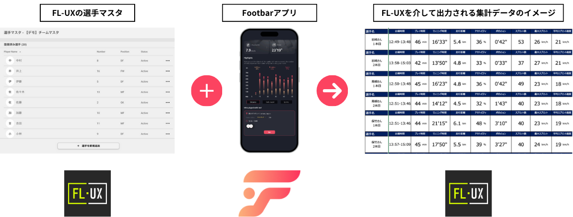 「FL-UX」と「Footbar」を併せてご利用いただくことで、FL-UX上の選手情報とFootbarのデータを紐付けて、プレー後に各選手のトラッキングデータがFL-UX上に集約されます。