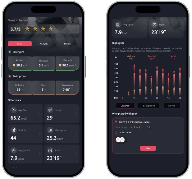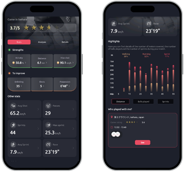 Footbarでは、フィジカルスタッツ(走行距離などのデータ)とテクニカルスタッツ(キックに関するデータ)の両方が取得可能です。