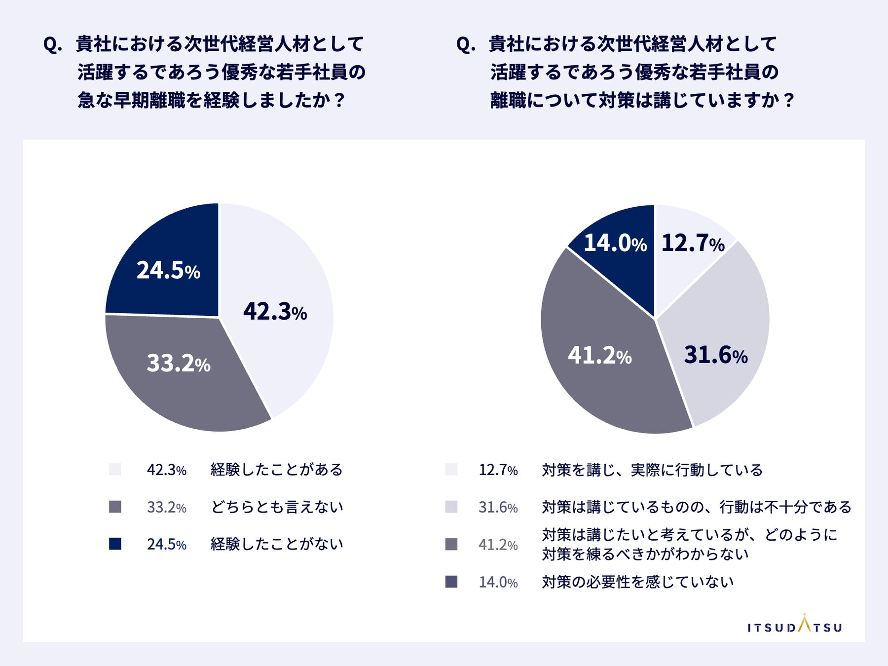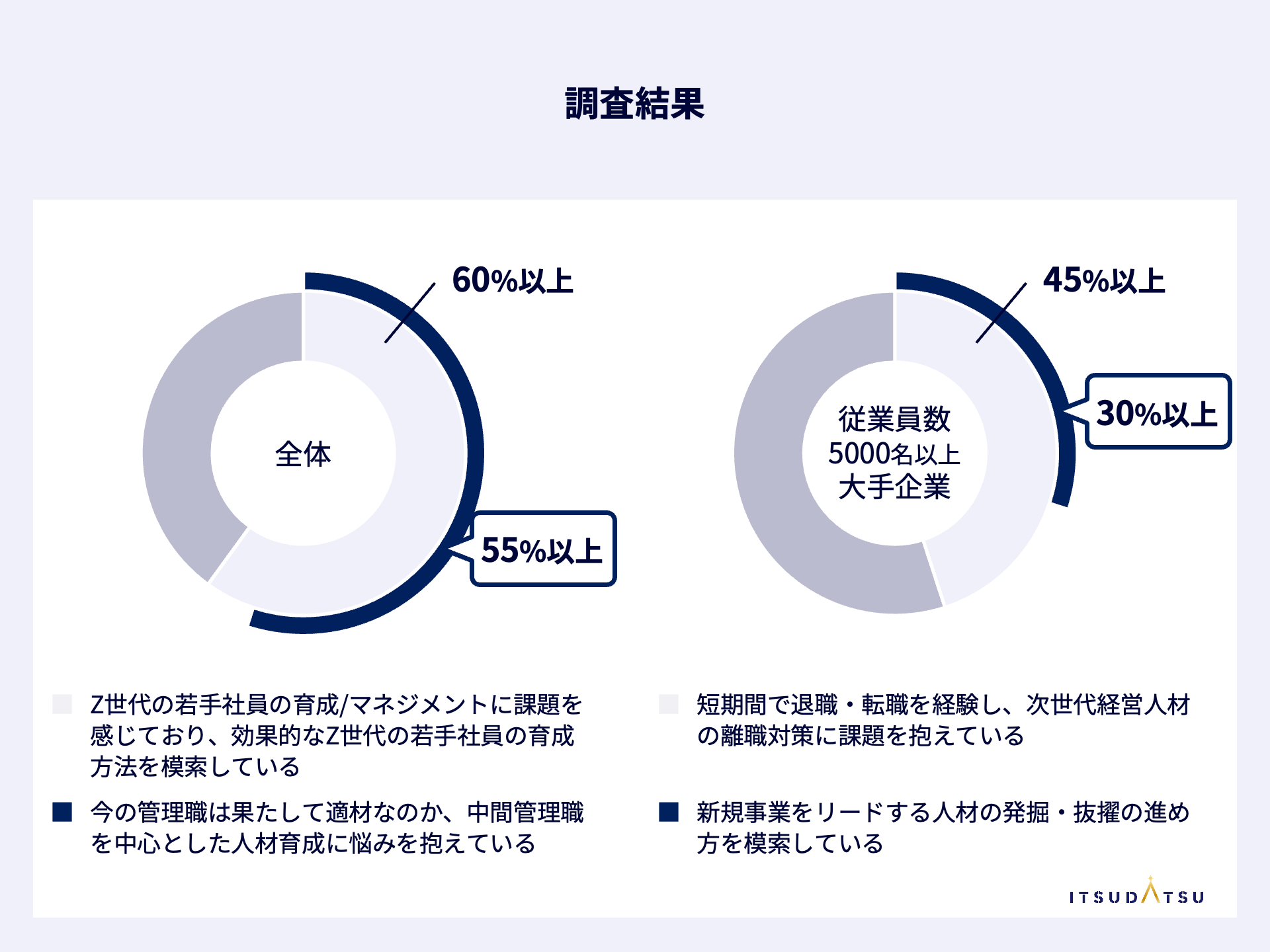 ・従業員数5000名以上の大手企業の45%以上が、次世代経営人材の優秀若手社員の短期間での「退職・転職」を経験し、「これから活躍するであろう次世代経営人材の離職についてどのような対策を打つべきか分からない」との課題を抱えている。