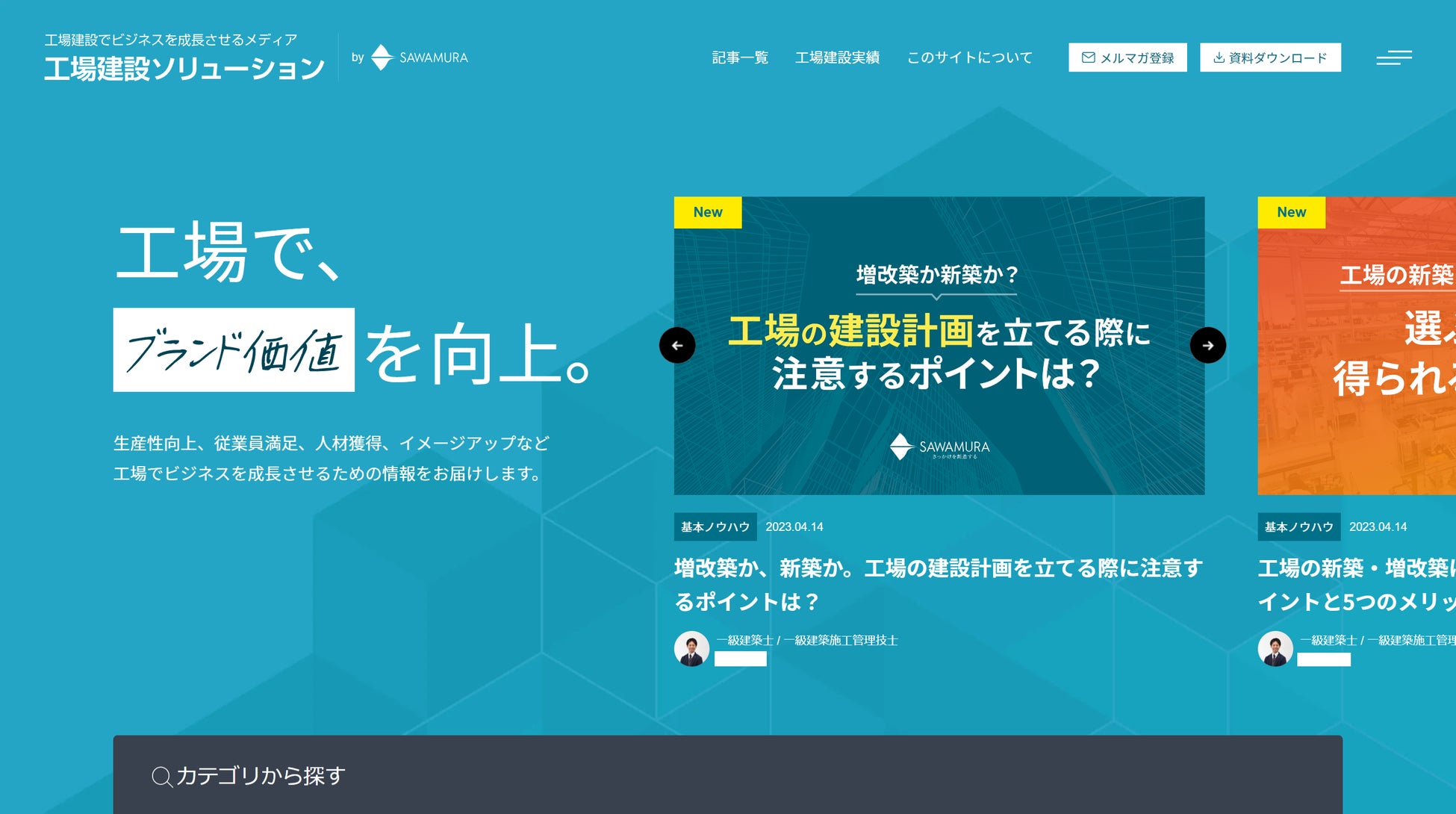 SAWAMURAは営業・設計・施工管理が1チームとなって、お客様とともに事業や組織の課題解決を目指す伴走型の建設会社として、工場建設・改修を設計施工一貫方式(デザインビルド)で手掛けています。そこで、自社の知識・ノウハウを確かな形で世の中に発信し、信頼できる情報として役立てていただけるメディアサイト「工場建設ソリューション」を立ち上げました。