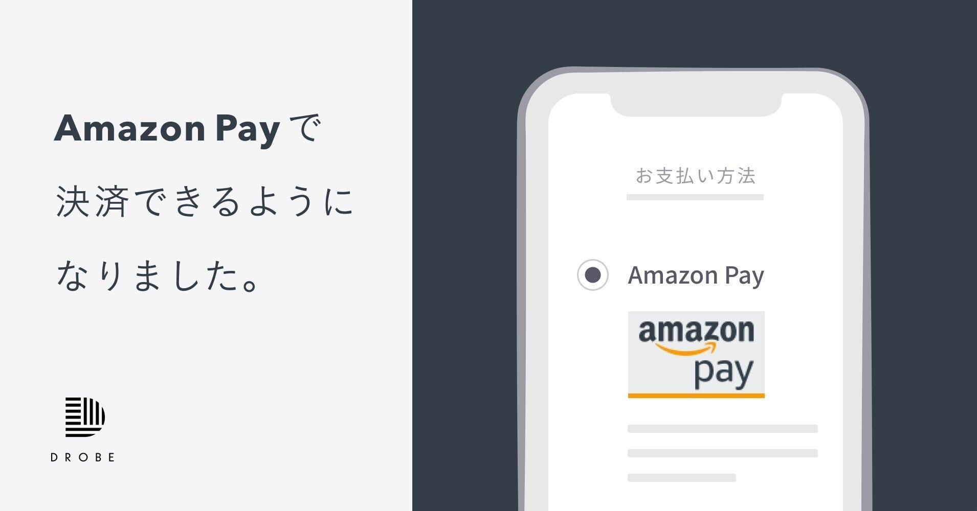 パーソナルスタイリングサービスの「DROBE」は3月4日(金)より、セレクトBOXの決済方法(ストアは今後対応予定)に『Amazon Pay』を新しく導入いたしました。これによりAmazonアカウントを保持しているユーザーは、新たに決済情報を入力することなく、Amazonアカウントに登録している配送先情報やお支払い情報などを利用し、これまで以上にスムーズなDROBEでのお支払いが可能になりました。DROBEでは引き続き、簡単・安心・便利にサービスをご利用いただけるよう、サポートを続けてまいります。
