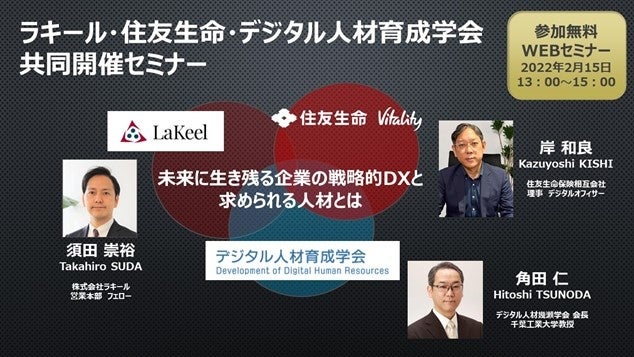 企業のDX推進を支援する、株式会社ラキール(本社:東京都港区、代表取締役社長:久保 努、以下「ラキール」)は、この度、デジタル人材育成学会と共催のオンラインセミナーに登壇することをお知らせします。本セミナーでは住友生命保険相互会社(以下「住友生命」)と共に、未来に生き残る企業について考えます。