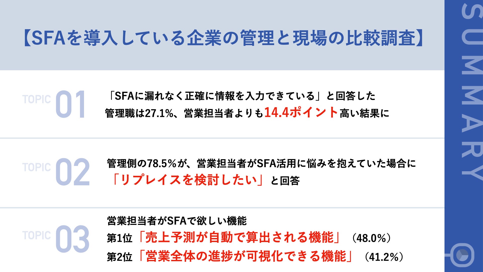 まず、結果として、部長・課長、営業担当者の半数以上は、SFAツールに顧客情報や商談情報を「漏れなく正確に」「顧客情報や商談情報を商談後すぐ」に入力できており、更に、約3割がSFAツールで、漏れなく「ネクストアクション」の管理を行うことができている実態が明らかとなりました。一方で、「使いやすさ」の面では、部長・課長より、営業担当者の方が「使いづらい」と感じており、「直感的に操作できるような画面にカスタマイズできないから」や「入力する項目が多いから」などが理由として挙がりました。ただし、管理側の部長・課長の約8割は、営業担当者がSFAツール活用に悩み・課題を抱えていた場合は、リプレイスを検討しており、その際には、営業担当者からは「売上予測が自動で算出される機能」や「営業全体の進捗が可視化できる機能」が望まれているようです。実は売上予測が自動で算出される機能」や「営業全体の進捗が可視化できる機能」は多くのSFAが保有しており、すでに機能があることを認知されていないケースも多いのかもしれません。その背景には、アンケート回答データにもあるように、機能が多すぎてわからない、直感的にわかりづらいなどの要因があるのかもしれません。