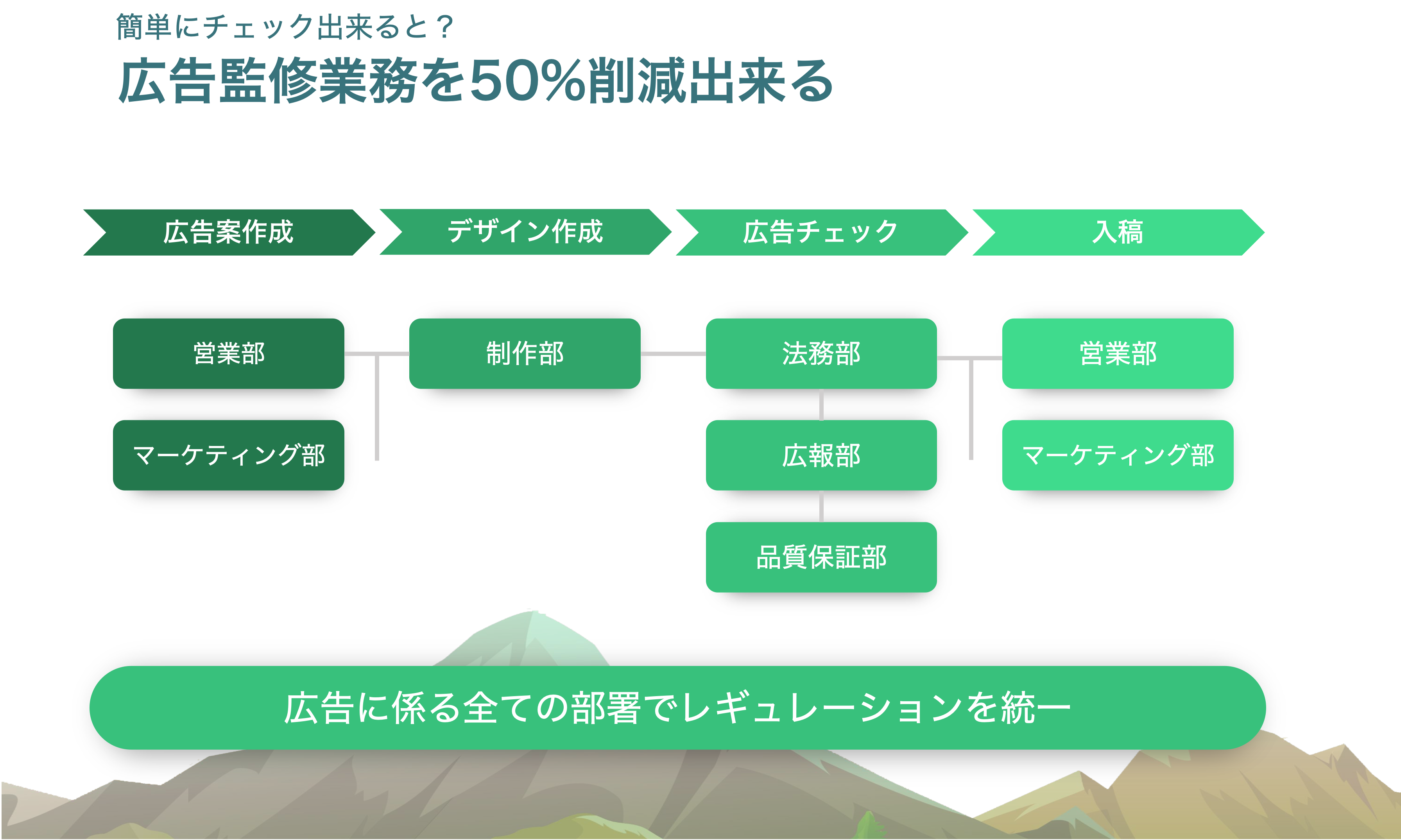 コノハを導入することで、広告に係る全ての部署でレギュレーションを統一することが可能になります。これにより、広告監修業務を50%削減することができます。