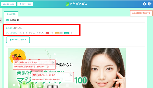 広告チェックツール『コノハ』は誇大表現になる恐れがある箇所をぱっと指摘してくれるサービスです。