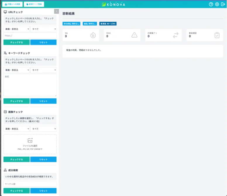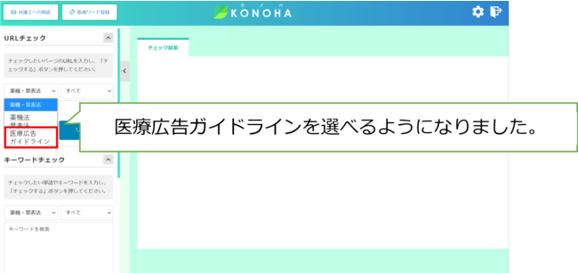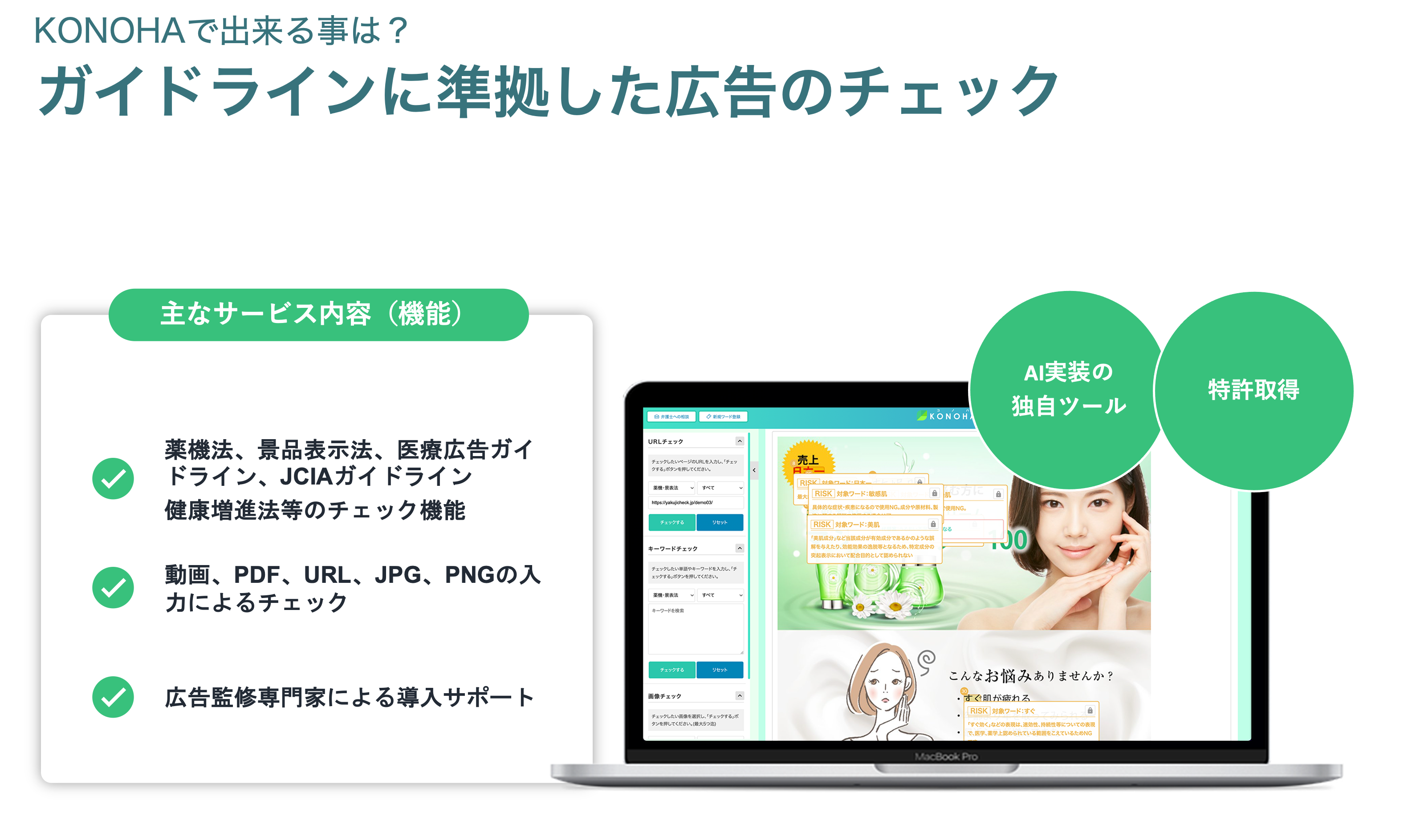 医療広告ガイドラインに準じていないことが原因で、広告審査落ちとなってしまう事例が多く発生していることを受けて、薬機法、景表法、健康増進法等関連法令の広告表現基礎データを整備し、広告チェックツール『コノハ』で医療広告ガイドラインに準拠しているかどうかチェックできるようになりました。