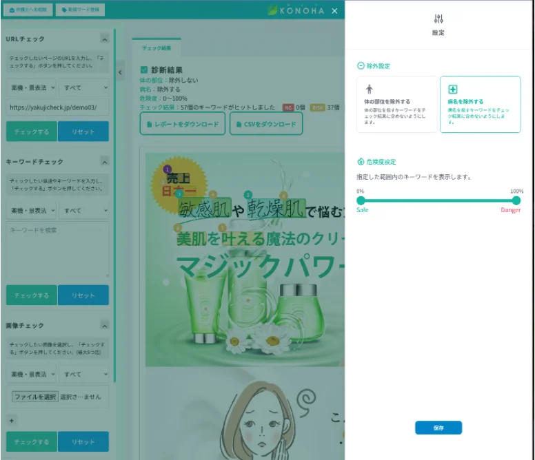 10,000以上の集積データから、各フレーズの指摘されるリスク値を算出し、個別で指摘されるリスク度合いに応じて3段階で表示する「安全/リスク/NGの3段階表示」、チェック結果の総数が表示される「チェック結果ヒット数表示」、 「チェック結果で体の部位を除外する機能が欲しい」というユーザーのご要望から、体の部位指摘除外設定機能が追加されました。