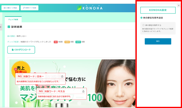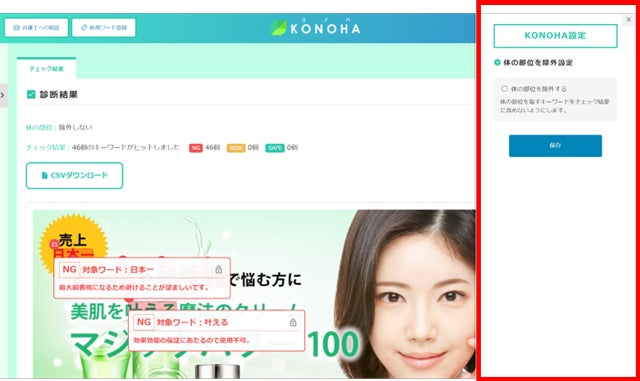 特定疾病の病名等がWebサイト上に掲載されていることが原因で、広告出稿先のガイドラインに抵触するという問題を解決するために病名に関する基礎データを整備することができたため、薬機法・景表法・健康増進法・医療広告ガイドラインに加えて、広告チェックツール『コノハ』で病名が含まれているか否かチェックできるようになりました。
