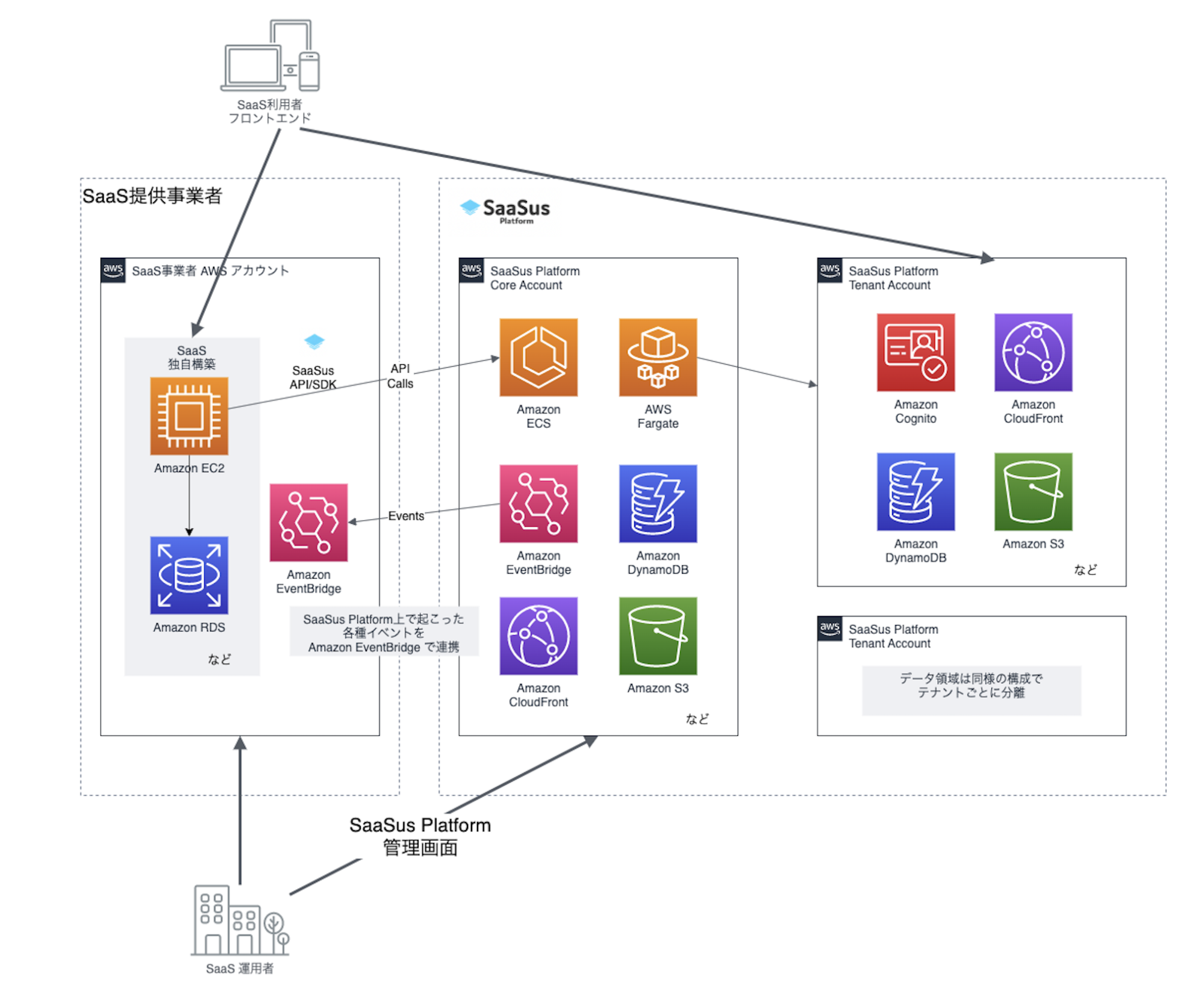 SaaSus Platform は、SaaS の共通部分を SaaSus 管理画面と SaaSus SDK/API で提供し、SaaS 事業者の作り込みの工数を削減、 SaaS の最適化をすることができる SaaS です。