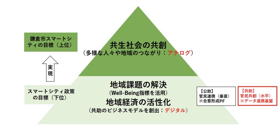 同構想において、鎌倉市は「鎌倉のまち並みや、歴史・文化を大切にしながら、AIやIoT、ビッグデータなど、 人にやさしいテクノロジーを活用することによる市民参加型のスマートシティ」を目指すとされ、基本理念として「① 市民起点」「② 共生の精神」「③ 鎌倉らしさの継承」が打ち出されています。