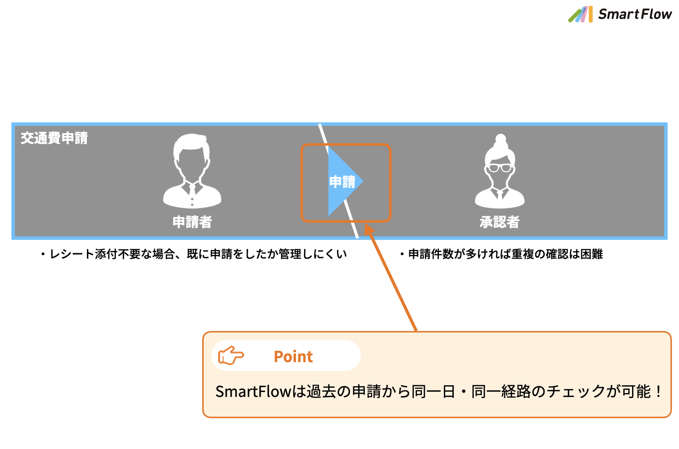 この要件に対応するため、SmartFlowでは交通費精算機能に重複申請防止機能を実装することと致しました。