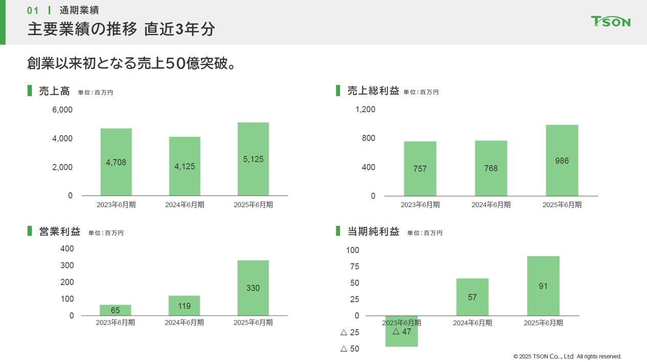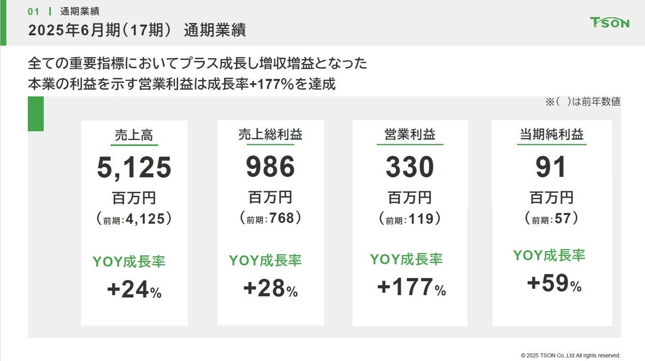 【株式会社TSON】2025年6月期決算発表 営業利益177%増 全ての重要指標でプラス成長し増収増益