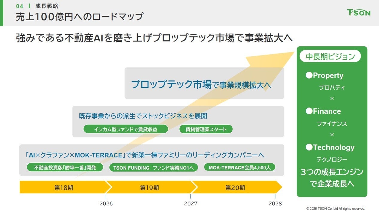 強みである不動産AIと不動産ファンドを磨き上げ、新築一棟ファミリーアパート事業を成長させることで、売上100億円を目指してまいります。