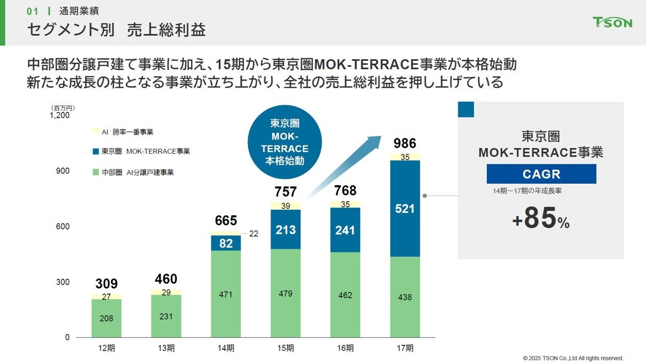 これまでの中部圏分譲戸建て事業に加え、15期から本格的に始動した首都圏新築一棟アパート事業が新たな成長の柱となり、先期から継続して全社の売上総利益を押し上げる要因となっています。