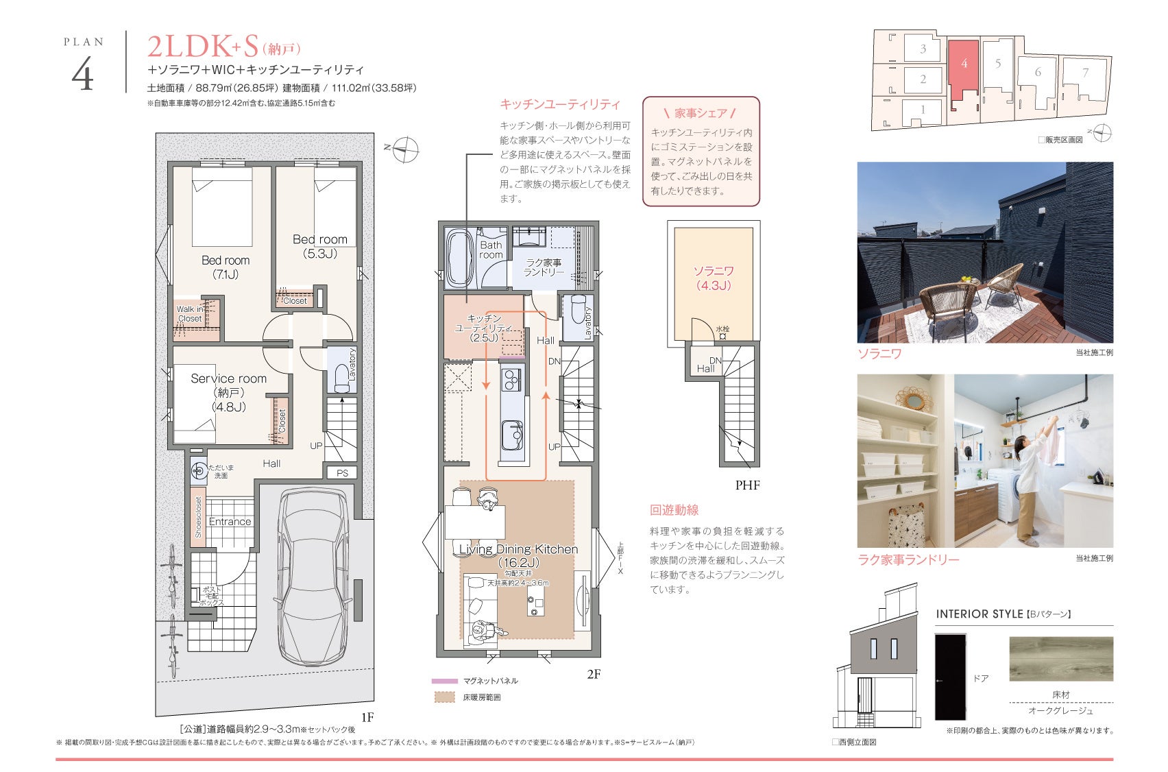 家族で協力しながら家事をする「家事シェア」の考え方を取り入れたキッチンユーティリティには、ゴミステーションを設置。マグネットパネルを活用してゴミ出しの日や連絡事項などを共有できます。また、キッチンを中心にした「回遊動線」は料理や家事の負担を軽減し、家族みんなのスムーズな移動が可能になるよう効率性の高いプランニングになっています。