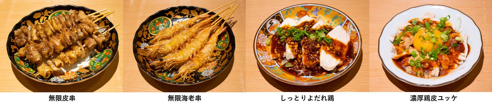 本家てけてけのメニューをベースに、渋谷本店でしか味わえない「皮パリ!中ジュワ!名物骨付鳥」など、オリジナル商品をご用意いたしました。他にも、見ているだけでもわくわくするような華やかなラインナップを取り揃えています。