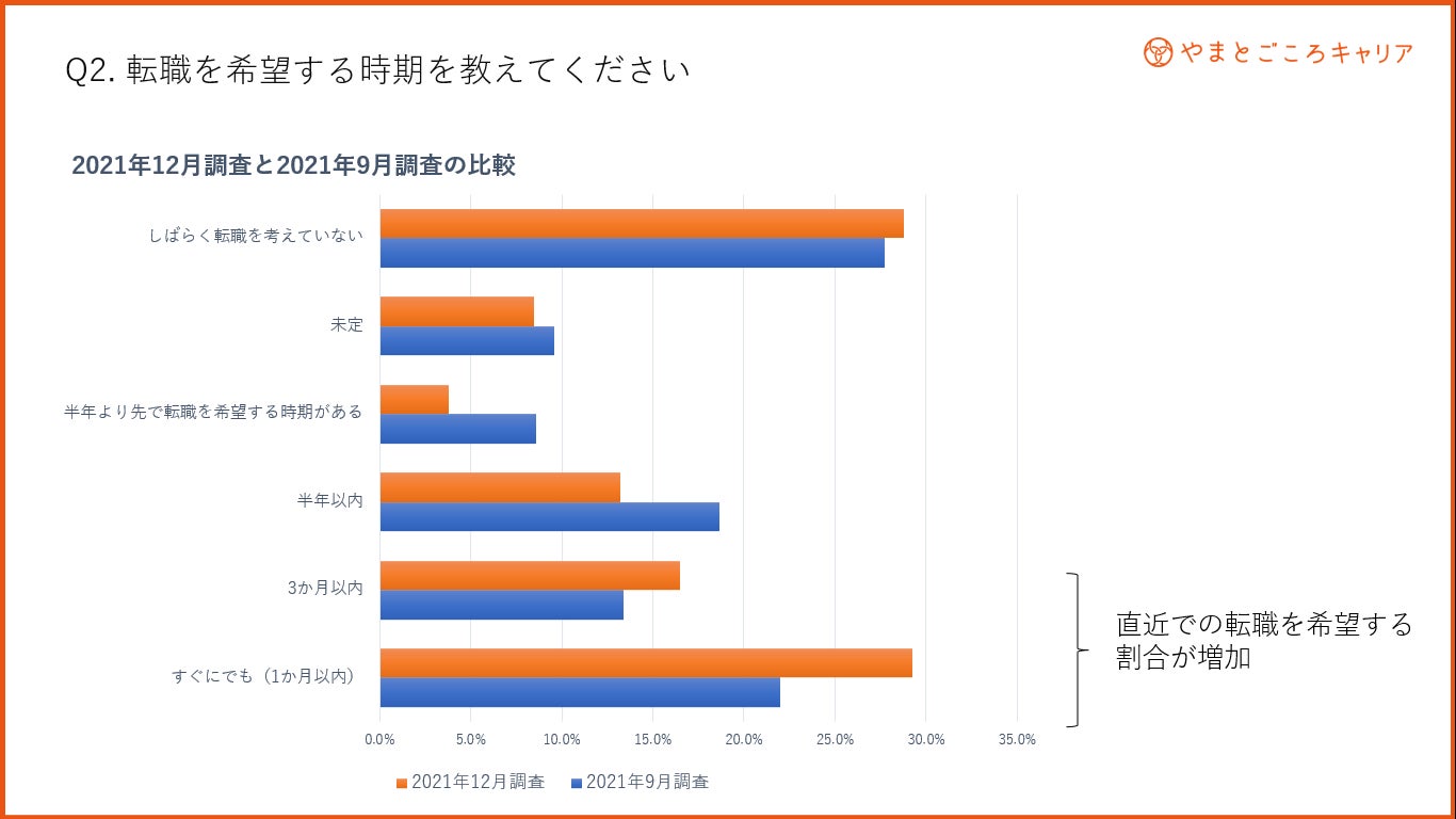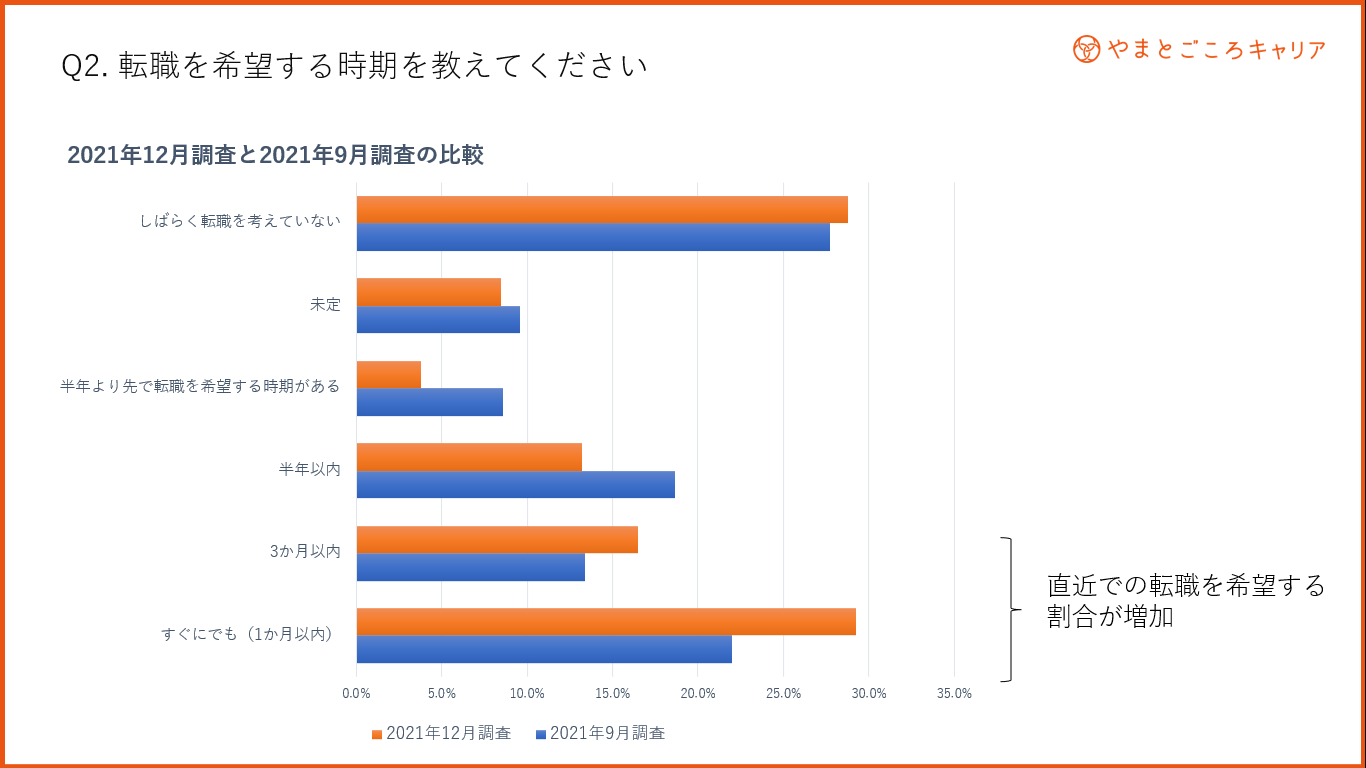 就職を希望する時期については、「すぐにでも(1か月以内)」と回答した方の割合が前回調査の2021年9月と比較して7.2%増加している。また、「3か月以内」の転職を希望すると回答した方も3.1%増加しており、直近での転職を希望する求職者が増加している。