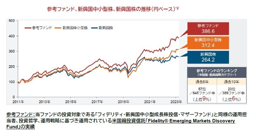 *2 FMR Co、LSEGよりフィデリティ投信作成。期間:2011年11月1日(参考ファンド設定日)~2024年1月31日。新興国株は、MSCIエマージング・マーケッツ指数(円)。新興国中小型株は、 MSCIエマージング・マーケッツ中小型指数(円) 。期間初を100として指数化。トータル・リターン。米国籍ファンドでの費用控除後。ランキングは2024年1月末時点。米ドルベース。Lipper Global分類の新興国株におけるトータル・リターンとランキング。この表に含まれるファンド情報のすべては、LSEG Lipperによって提供されたものであり、以下の条件に従う。Copyright2024© LSEG. すべての権利はLSEGに帰属。 Lipperはコンテンツの誤りや遅延、 またはそれに依拠して取られた行動に対して責任を負いません。上記は過去の実績であり、将来の動向、数値などを保証もしくは示唆するものではありません。