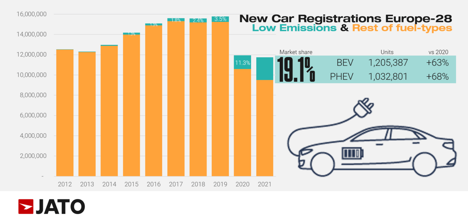 JATO Dynamicsの欧州28カ国のデータによると、2021年のピュアEVの累計販売台数は120万5,387台であった。これは、2020年に販売された73万9,329台より63%多く、2019年時の3. 4倍である。JATO DynamicsのグローバルアナリストであるFelipe Munozは「過去10年間ピュアEVは、2021年に新記録を達成したSUVを含むどのセグメントよりも速く成長している」と述べている。