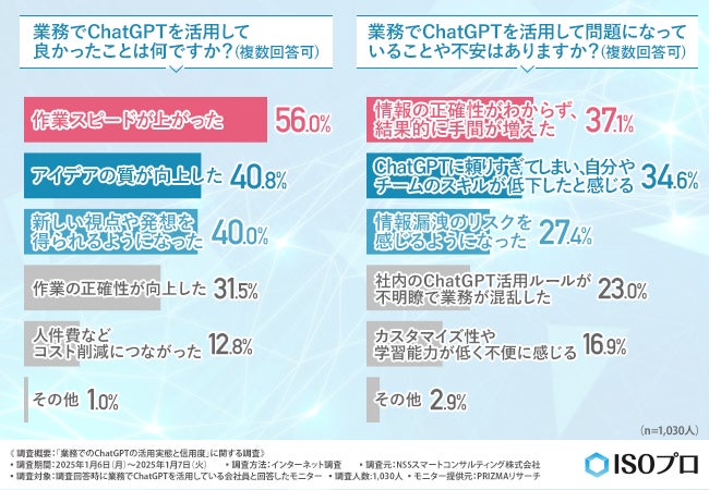 今回の調査で、多くの企業においてChatGPTが日常業務に取り入れられる中で、さまざまなメリットとともに、今後の課題が示されました。