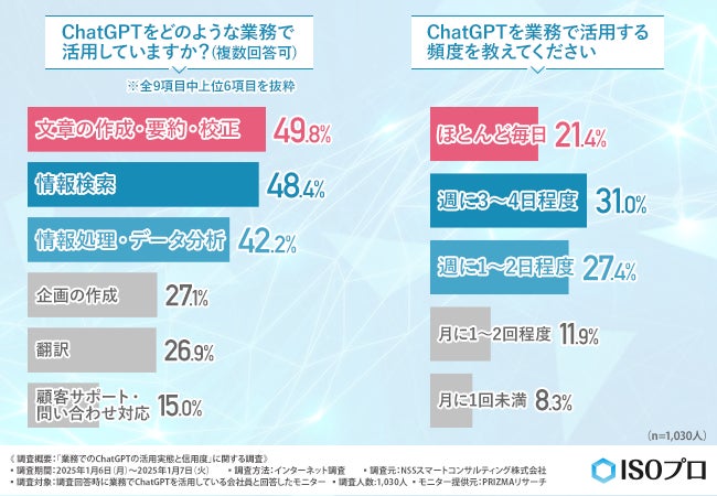 そこで今回、各種ISOの新規取得・運用サポートサイト『ISOプロ』(https://activation-service.jp/iso/)を運営するNSSスマートコンサルティング株式会社は、業務でChatGPTを活用している会社員を対象に、「業務でのChatGPTの活用実態と信用度」に関する調査を行いました。
