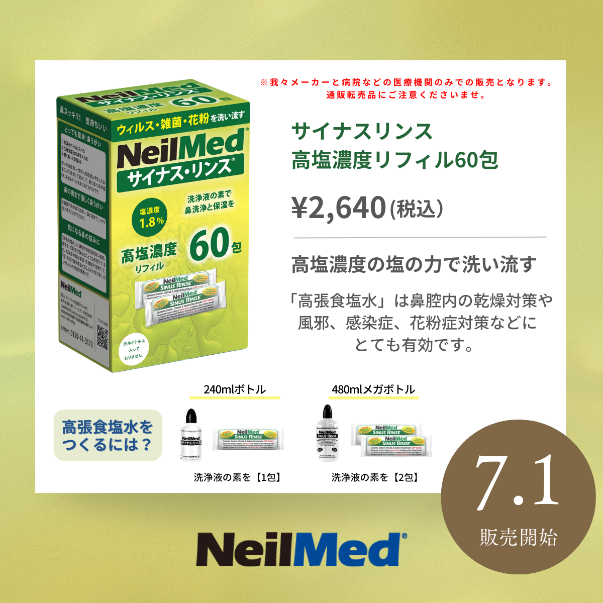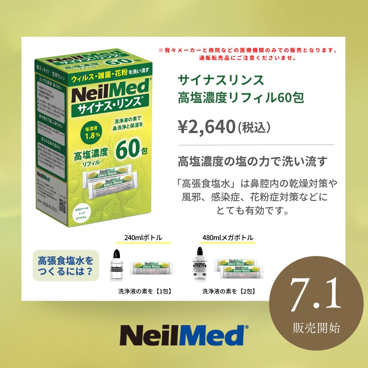 医療機器メーカーのニールメッド株式会社 (所在地:東京都千代田区、代表取締役:唐木 佑介)は、「サイナスリンス 高塩濃度リフィル」を7月1日より発売開始いたします。